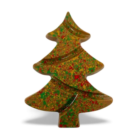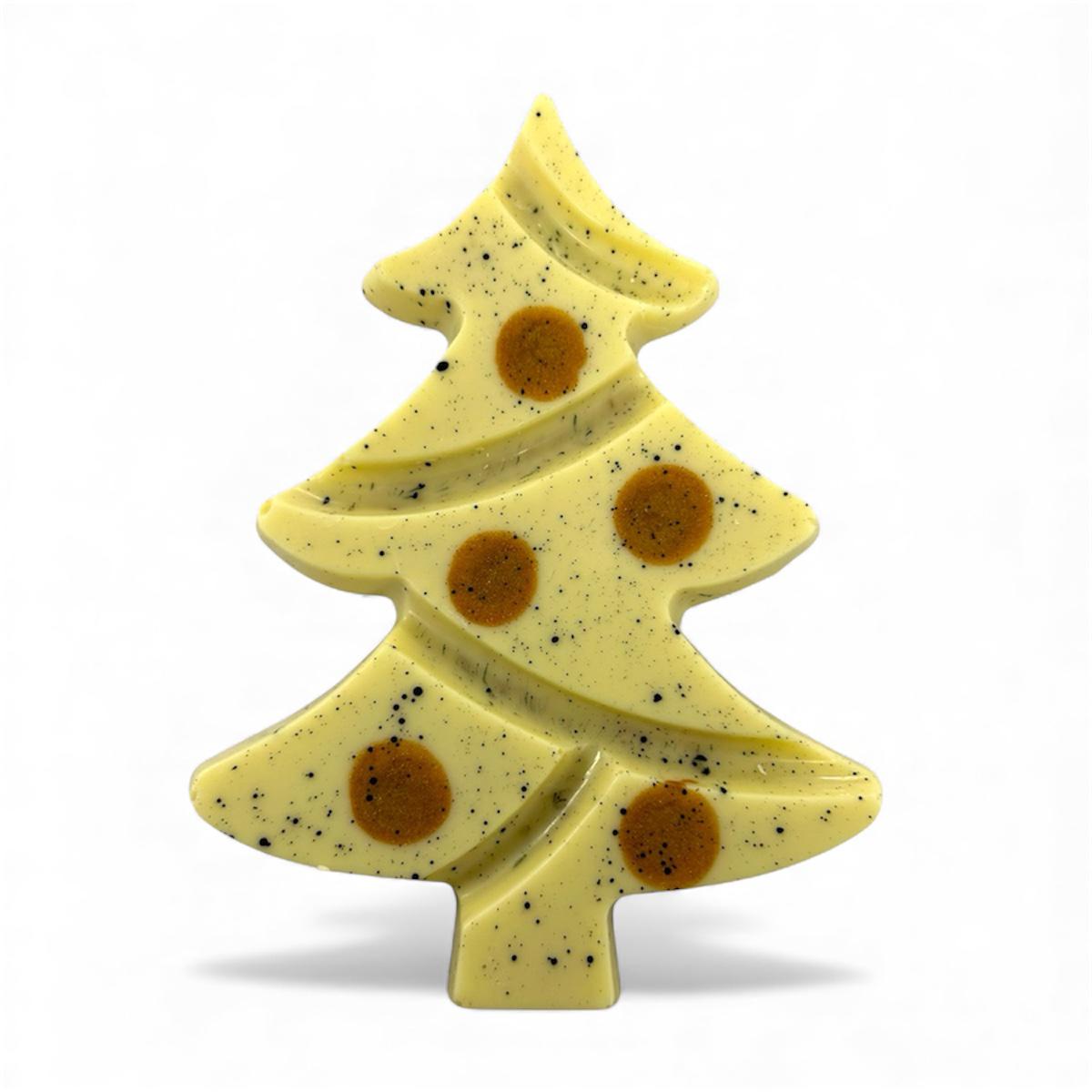 Kerstboom gemaakt van romige witte chocolade gevuld met butterscotch en crème brulée ganache .Gewicht ongeveer 100 gram.