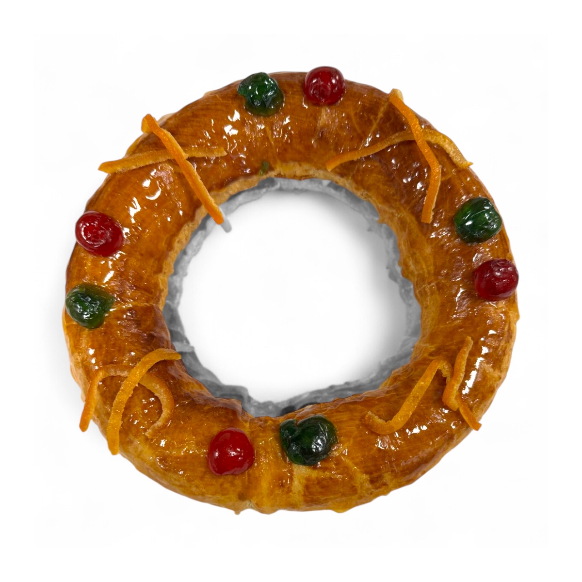 Ambachtelijk gemaakt roomboter bladerdeeg gevuld met amandelspijs afgewerkt met bigarreaux en gekonfijte sinaasappelsnippers.